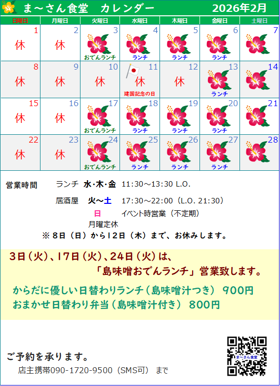 2月3,17,24日の火曜日お昼は、「島味噌おでんランチ」にて営業いたします。